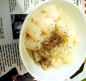 안녕하세요? 최근 차이나 타운 시장에 갔는데 싱싱한 조개 관자를 저렴하게 팔고 있더라구요.^^ 그래서 1파운드 정도 구매해 오늘은 메인요리로도, 에피타이저로도 좋은 '토마토 관자볶음'를 해보려고 합니다. ^^ 재료는 관자 적당량(저는 1파운드-작은 밥공기로 가득), 토마토 반개, 마늘 5~10개, 소금, 후추, 올리브유, 토마토소스(없어도무관) 관자는 키조개관자를 최고로 치는데 그 외에도 가리비, 국자가리비등 사이즈가 조금씩 다른 관자들이 있답니다. 오늘 할 토마토 관자요리는 생각보다 굉장히 간단하답니다. 첫번째는 흐르는물에 깨끗히 손질한 관자를 소금과 후추, 올리브오일로 재워둡니다. 저는 1파운드를 기준으로 소금 2ts, 후추 2ts, 올리브오일 4ts를 첨가했습니다. 생선비린내나 조개잡내등에 민감하신..